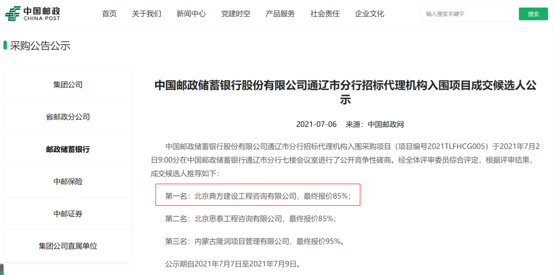 2021年7月2日,經(jīng)中國(guó)儲(chǔ)蓄銀行股份有限公司通遼市分行全體評(píng)審委員綜合評(píng)定后,發(fā)布了招標(biāo)代理機(jī)構(gòu)入圍項(xiàng)目成交候選人公告,遠(yuǎn)瓴數(shù)據(jù)集團(tuán)旗下子公司北京典方建設(shè)工程咨詢有限公司以第一名成績(jī)成功入圍!成為中國(guó)儲(chǔ)蓄銀行股份有限公司通遼市分行代理商之一,服務(wù)期自合同簽訂之日起3年,承擔(dān)該分行采購(gòu)項(xiàng)目的代理工作。